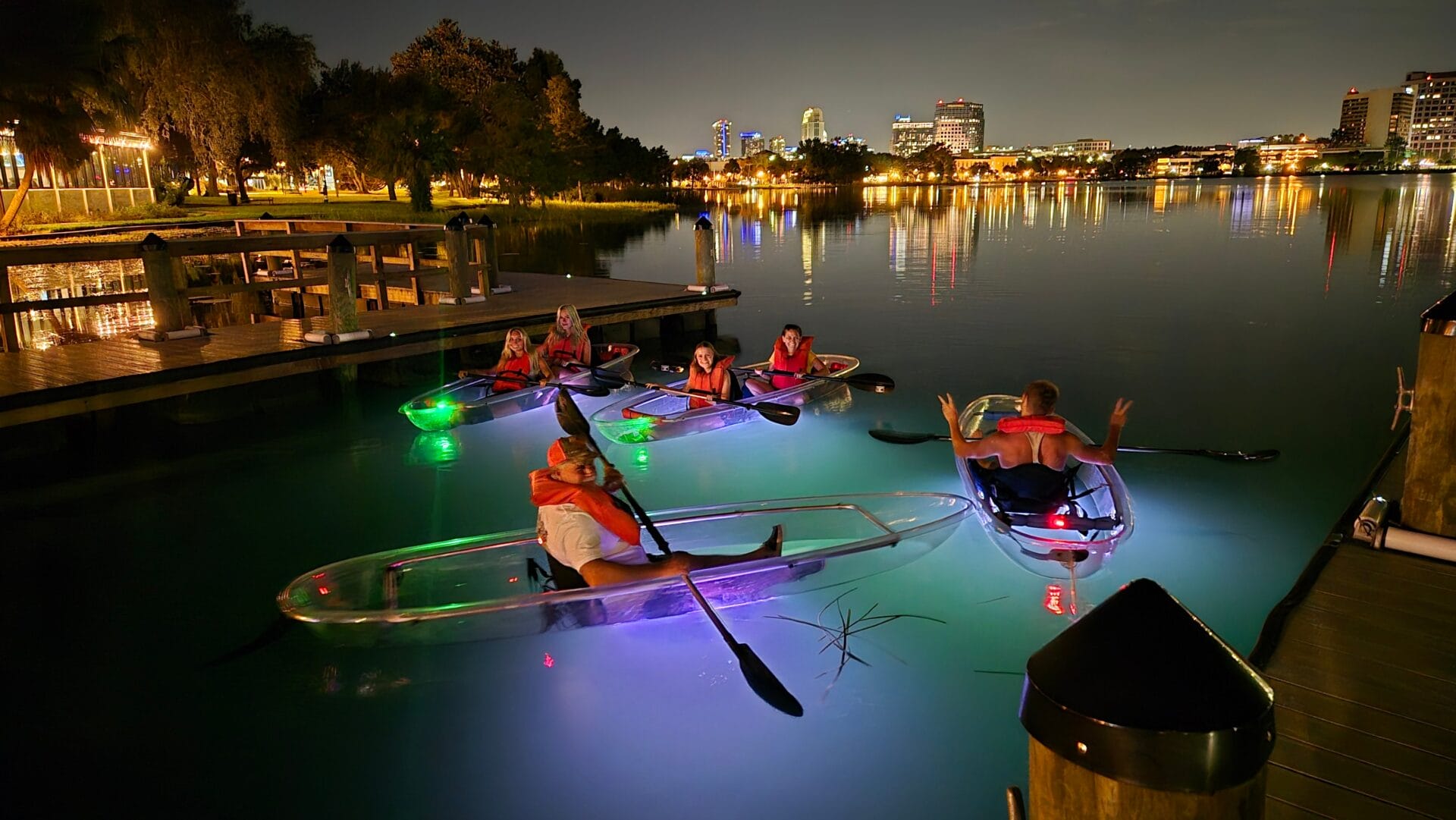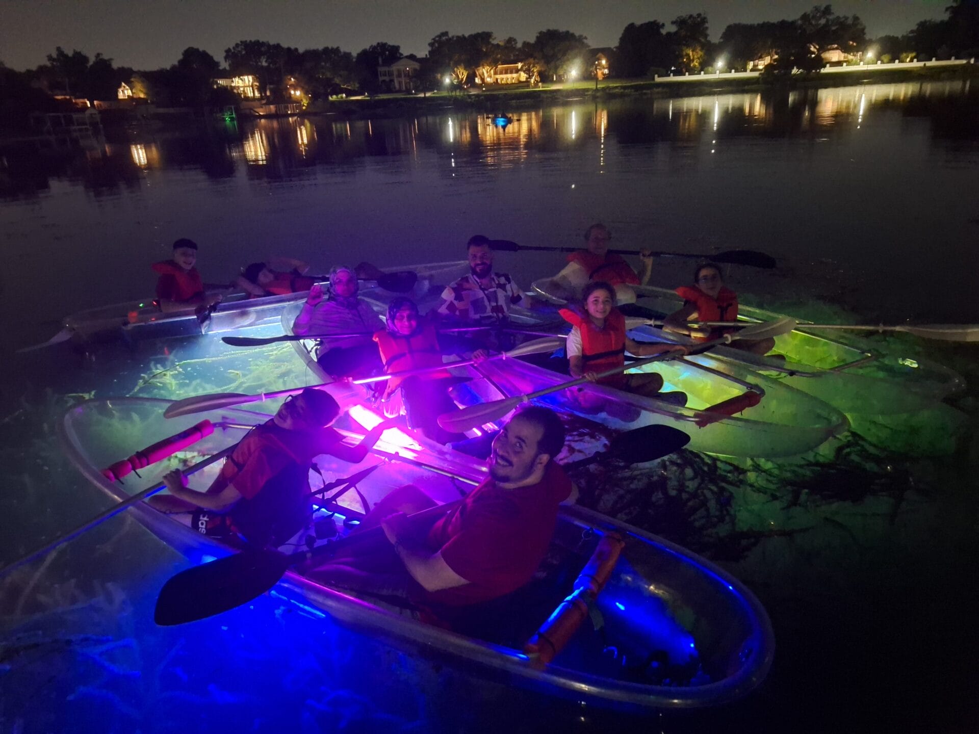 We offer Clear 2-Person Kayaks, Clear Single Kayaks, and Paddleboards outfitted with our super bright multi-colored LED lighting systems for our tours.