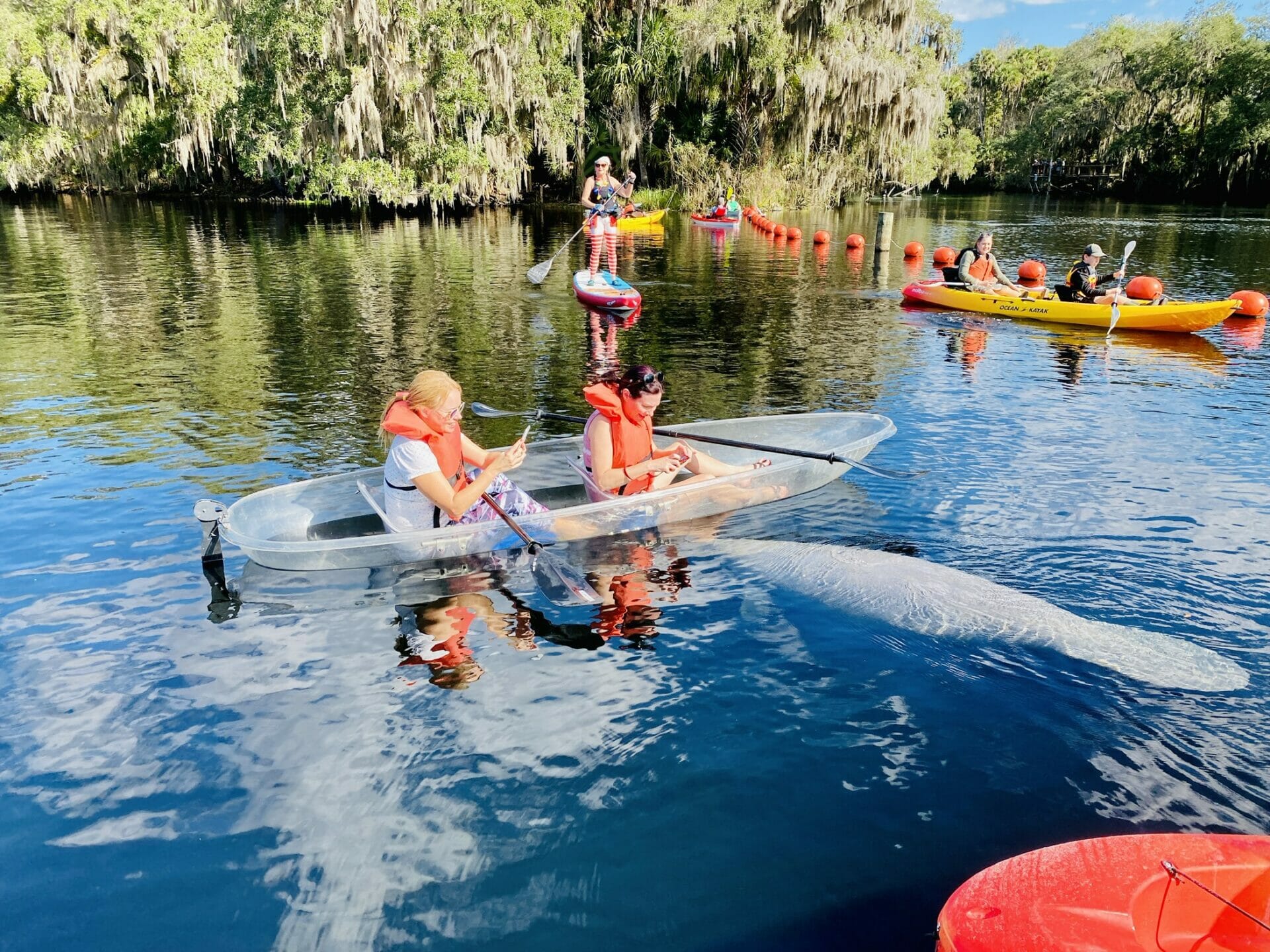 Traverse the crystalline waters and learn about the vibrant ecosystems with our expert clear kayak guides, all while immersing in the beauty of ancient forests and clear waters. You can embark on your fun kayak adventure with confidence! Our super-stable transparent kayaks ensure an unforgettable manatee experience near Orlando. Whether you prefer paddle boarding or enjoying unparalleled views with our clear single kayaks and glass bottom 2-person kayaks, we guarantee a memorable adventure!